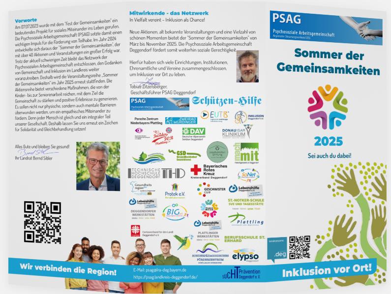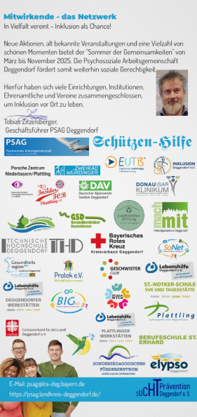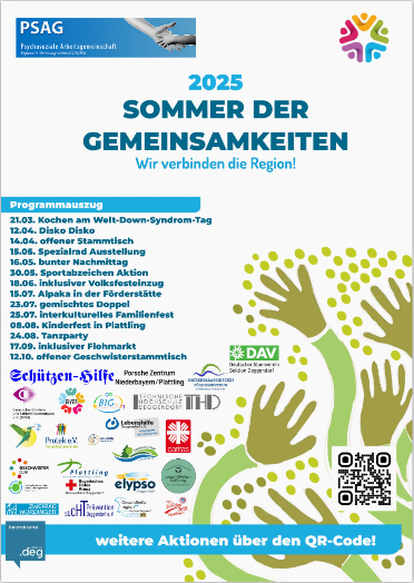 Mit dem "Fest der Gemeinsamkeiten startete im Landkreis Deggendorf ein einmaliges Inklusionsprojekt, welches in der Bevölerkung fiel Anklang fand. Deshalb entschied sich die Psychosoziale Arbeitsgemeinschaft (PSAG) Deggendorf im Jahr 2024 eine Aktionsreihe "Sommer der Gemeinsamkeiten" ins leben zu rufen. Aufgrund der guten Resonanz der Inklusionsreihe finden auch im Jahr 2025 wieder diverse Aktionen und Maßnahmen statt, die von den psychosozialen Akteuren organisiert werden. Das Hauptziel dieser Initiative ist es, die Inklusion vor Ort zu stärken und zu fördern, Einsamkeit abzubauen und soziale Gemeinschaft zu generieren. Von März bis November 2025 finden unzählige Veranstaltungen und Maßnahmen im Landkreis Deggendorf statt.