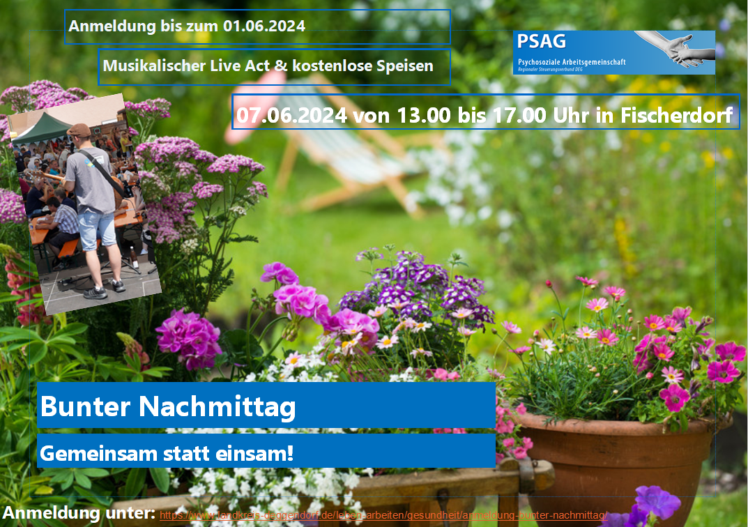 Im Rahmen des Sommers der Gemeinsamkeiten veranstalten die PSAG Deggendort und der Gesundheitliche Sozialdienst im Vereinsheim Fischerdorf einen bunten Nachmittag, welcher musikalisch von Lukas Burian begleitet wird. Es gibt kulinarische Köstlichkeiten, die für alle Teilnehmer kostenlos sind. Weiterhin erhält jeder ein Freigetränk. Die Platzzahl ist begrenzt, deshalb schnell anmelden:
