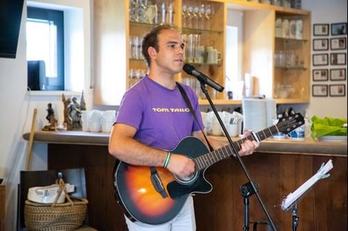 Musikalische Unterhaltung bot Lukas Burian, der mit seinen Werken begeisterte. Mit einer Mischung aus Pop und Rock, begleitet von seiner Gitarre heizte er den Teilnehmern ein. Das Theaterstück "Der Zuschuss" in dem ein Bürger Geld beim Amt beantragte, organisiert vom Tagwerk des BRK Deggendorf unter Leitung des Sozialpädagogen Siegfried Stojmanovski, sorgte für viele Lacher und gute Stimmung.