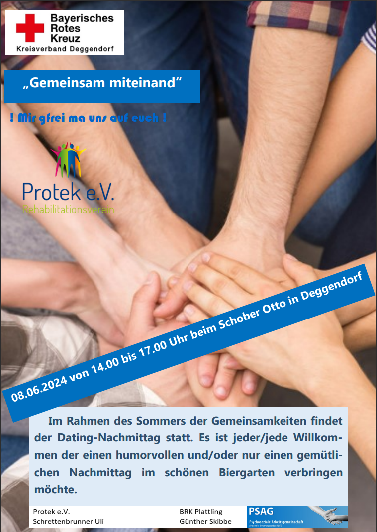 Meldung vom 06.06.2024 Protek e.V. und der Sozialpsychiatrisch Dienst des BRKs veranstalten einen gemütlichen Datingnachmittag - vorbei schauen lohnt sich!