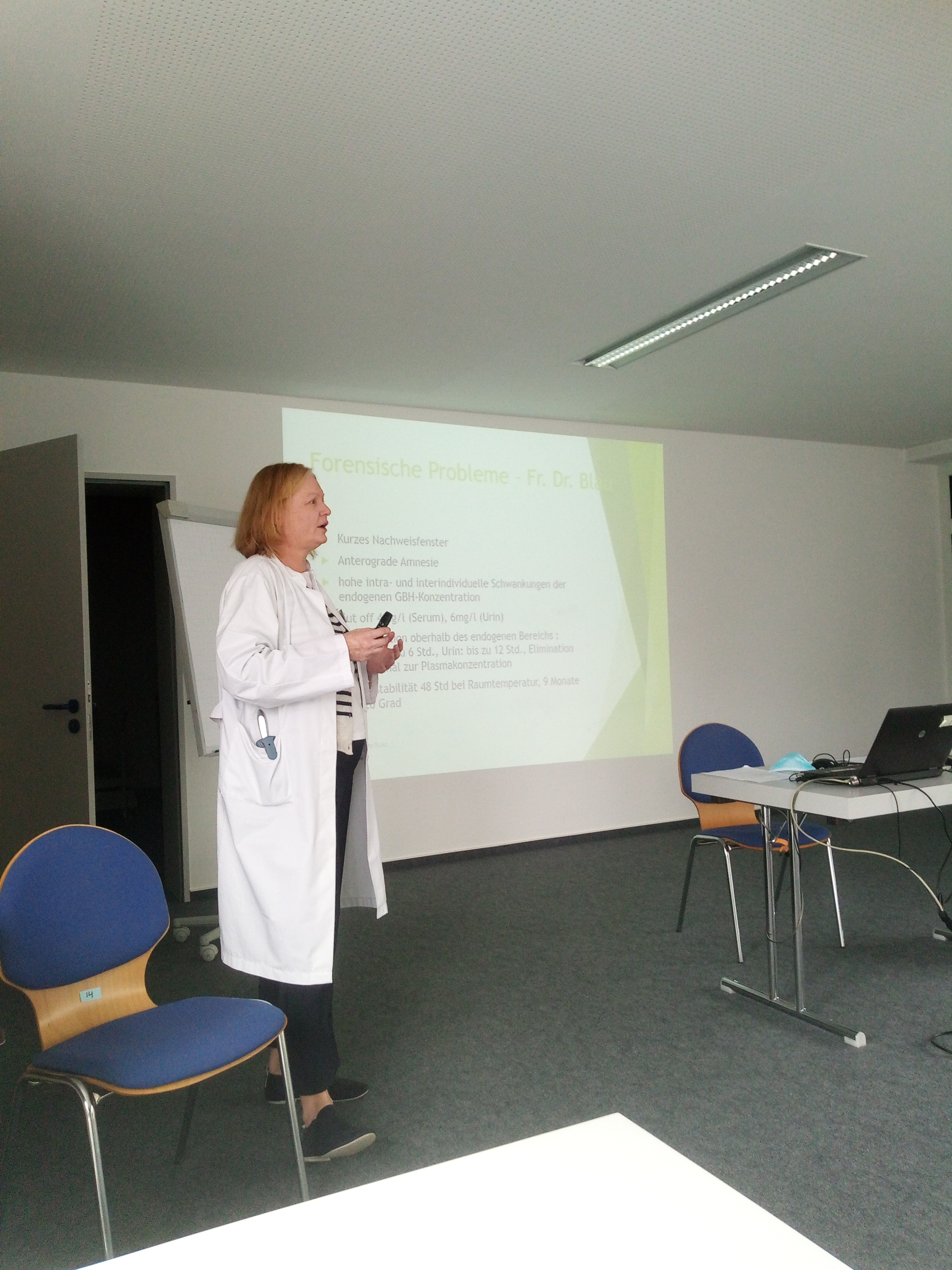 Beim Arbeitskreistreffen Suchttherapeutische Versorgung DEG/REG referierten im interdisziplinären Team Fr. Dr. Blau, Hr. Lorenz und Hr. Zitzelsberger über das Suchtmittel Gamma-Hydroxy-Buttersäure (GHB). Der Stoff ist ein Salz, welches leicht in Flüssigkeiten aufgelöst werden kann. Gemäß den Ausführungen von Fr. Dr. Blau hat man nur ein kurzes Nachweisfenster (48 Stunden bei Raumtemperatur; cut off bei 4mg/l [Serum] und bei 6 mg/l [Urin]). Weitehrin ist die Wirkweise der Droge von der Dosis abhängig. Bei 0,5g bis 1 g stimulierend, euphorisierend, ab 2,5 g folgt tiefer Schlaf und bei einer Dosis über 3 g sind komatöse Zustände und Atemdepression möglich. Letztere Wirkung brachte dem Stoffe auch die Bezeichnung „date rape drug“ ein. In den Medien taucht GHB immer wieder als Vergewaltigungsdroge auf. Hr. Zitzelsberger berichtete in diesem Kontext über eine britische Studie (mit 75 Probanden) in der Patienten in der Notaufnahme angaben, dass ihnen jemand K.O.-Tropfen oder Drogen in das Getränk gekippt hätte. In keinem einzigen Fall konnten betäubende Suchtmittel wie GHB, Ketamin oder Rohypnol festgestellt werden. Jedoch hatten 2/3 der Probanden eine extrem hohe Blutalkoholkonzentration. Insofern sollte die Bevölkerung auch sensibilisiert werden, dass exzessiver Alkoholkonsum ebenso die Gefahr beinhaltet Opfer einer Straftat zu werden.